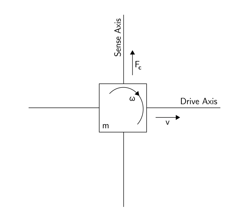 Gyroscope가 회전할 때 Coriolis effect 에 의해 수직방향의 sense axis를 따라 2차 진동이 유도된다. angular velocity 는 이 2차 진동을 이용해 측정할 수 있다.