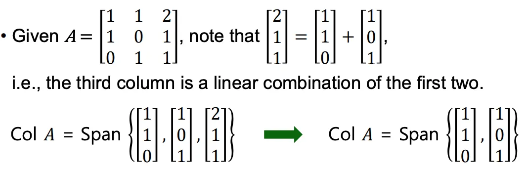 행렬 의 column vectors들 이 linearly dependent한 경우 Span을 늘리지 않게된다.