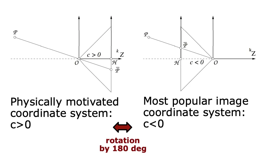 카메라 원점과 이미지 평면과의 거리를 로 표현한다. (주로 < 0 으로 둔다, 그대로 두면 상이 반대로 맺히기 때문입니다)
