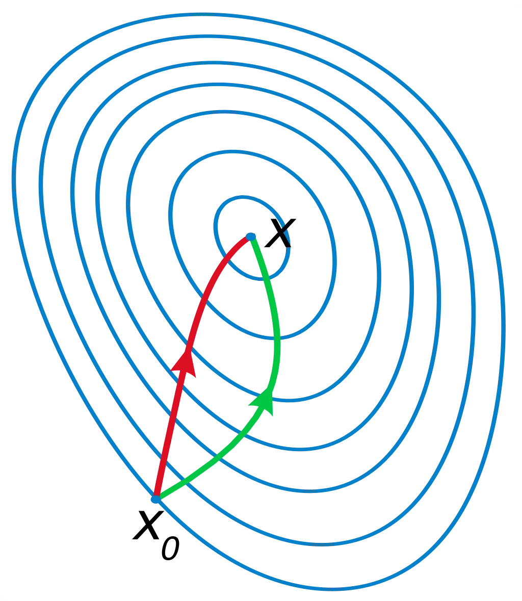 수식에서 알 수 있지만, gradient 값 뿐 아니라, curvature 정보도 고려하기 때문에 더 직접적인 루트로 이동할 수 있게 된다.